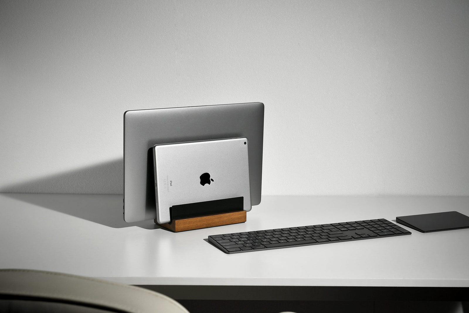 The stand’s design maximizes desk space while keeping your laptop and other devices securely in place. Choose from the light and natural ashwood or the deep, rich walnut finish to complement your office decor, all while adding a touch of sophistication.