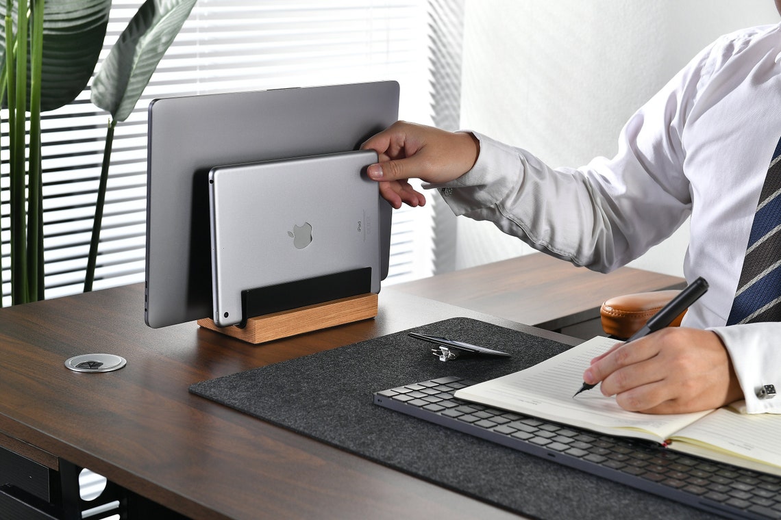Transform your workspace with the Vertical Laptop Stand for Desk, a docking station that elegantly combines functionality with style. This wooden double tech bed is designed for charging and displaying your devices, making it an ideal personalized desk accessory for men and a thoughtful corporate gift. Featuring a non-slip base and a dedicated laptop dock, it’s crafted from high-quality natural ashwood or walnut finish wood and complemented by sturdy black metal.